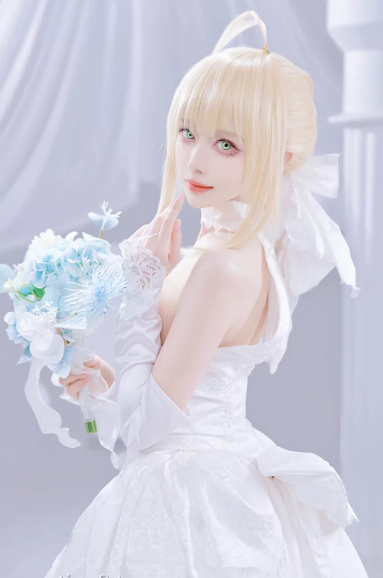 我们今天的主角,Coser_Shika小鹿鹿,显然就是这种人。看编号,NO.0131。一百三十多套作品的积累,这说明她早就在这个圈子里站稳了脚跟。到了这个阶段,出作品已经不是为了证明自己,更多的是一种对自己热爱的交代。选择Saber花嫁,更像是一种“还愿”,一种对经典的致敬。